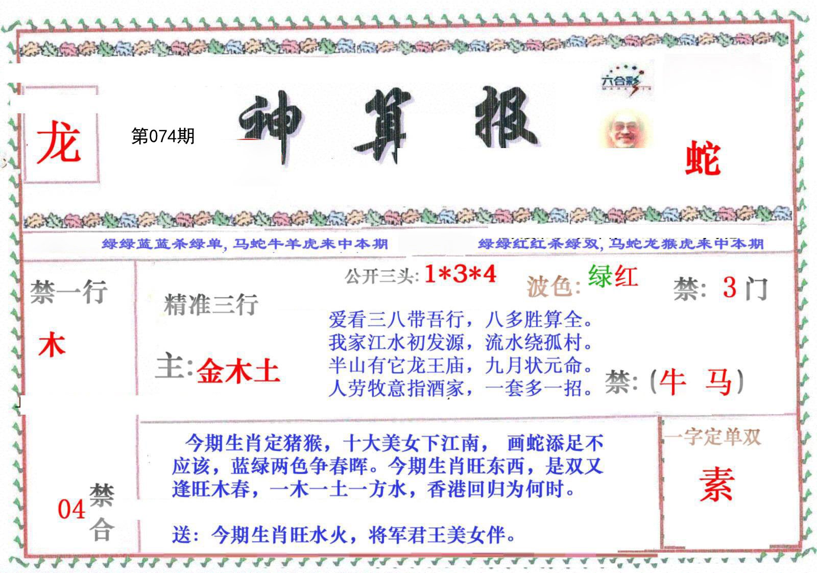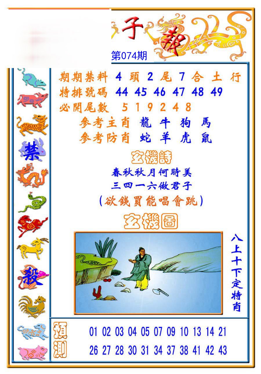 | 074期:必中七肖: 牛兔虎鼠蛇猴龙 |